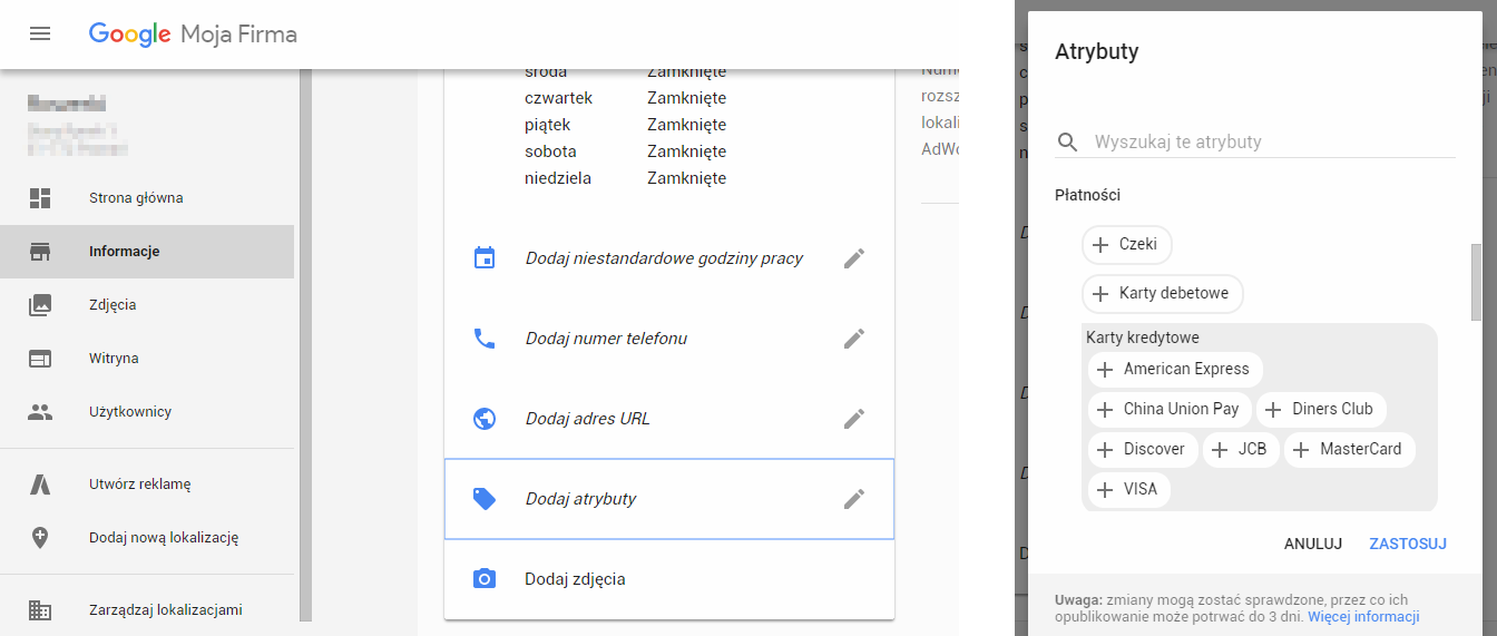 Zamiast opisu właściciel wyszukiwarki zaproponował inne rozwiązanie – atrybuty. Są to krótkie, kilkuwyrazowe opisy miejsca, informujące np. o dodatkowych ułatwieniach dla niepełnosprawnych, możliwości płatności kartą itp. Aby je zmienić, wystarczy wybrać odpowiednią opcje w sekcji „Informacje” w panelu zarządzania wizytówką: