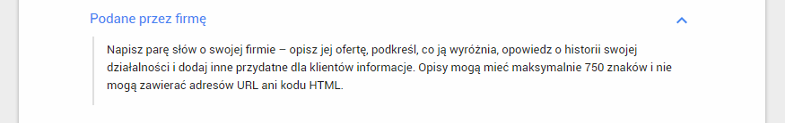 Opcja umożliwiająca dodanie opisu firmy nie jest jeszcze dostępna dla wszystkich, [29.03.2018 – teraz powinni mieć do niej dostęp wszyscy] jednak można spodziewać się jej pojawienia w najbliższym czasie. Sugerują to informacje od innych użytkowników oraz nowy wpis na stronie pomocy Google Moja Firma: