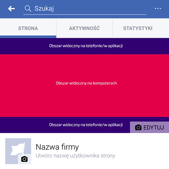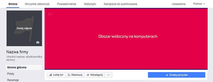 Portal pozwala dodać tylko jedno zdjęcie, najlepiej więc stworzyć obraz o wymiarach 820 na 462 piksele. Dla ułatwienia warto skorzystać z poniższego szablonu – kolorem zaznaczono obszary, które widoczne są na urządzeniach mobilnych oraz na przeglądarkach.